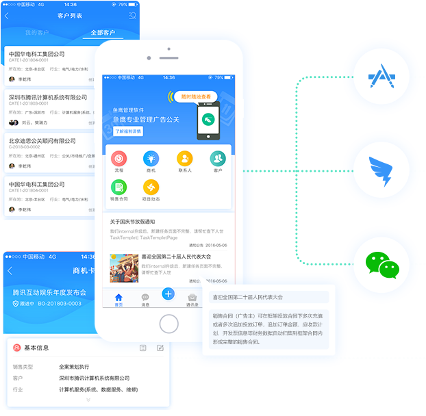 將魚(yú)鷹系統(tǒng)的信息同步至企業(yè)微信里,在微信里實(shí)現(xiàn)魚(yú)鷹系統(tǒng)的消息提醒、流程審批、待辦提醒、信息查詢(xún)。