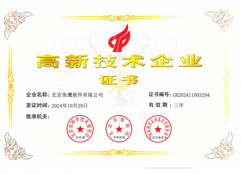經(jīng)過嚴格的測評和層層審批流程,近日,魚鷹軟件榮獲由北京市科學(xué)技術(shù)委員會、北京市財政局、北京市國家稅務(wù)局聯(lián)合認定頒發(fā)的“高新技術(shù)企業(yè)”稱號,魚鷹軟件的整體技術(shù)水平和科技創(chuàng)新能力得到國家相關(guān)部門的肯定和認可。