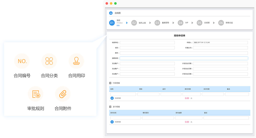 自定義審批節(jié)點,自定義合同審批關(guān)鍵信息,支持關(guān)聯(lián)用印申請,支持合同附件上傳,自動生成合同編號、合同分類存儲入合同庫。