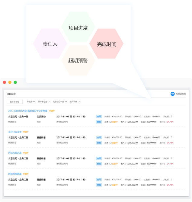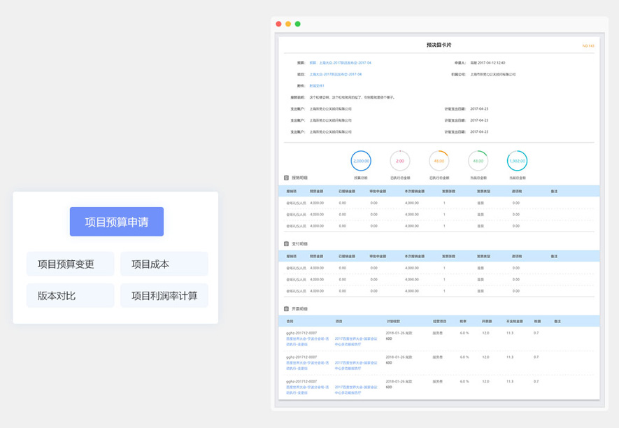 項(xiàng)目預(yù)算申請(qǐng)、項(xiàng)目預(yù)算變更、版本對(duì)比,項(xiàng)目成本、項(xiàng)目利潤(rùn)率計(jì)算。