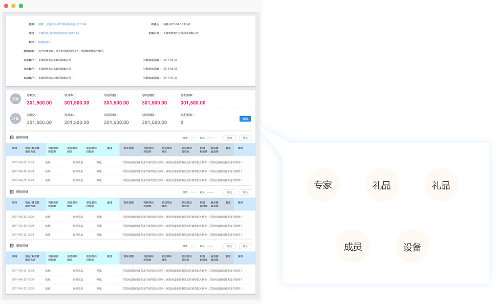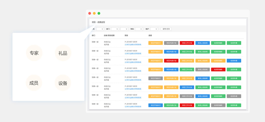 以時(shí)間軸的形式,將項(xiàng)目資源(專家、禮品、設(shè)備、成員等)的項(xiàng)目占用情況予以展示;從而使項(xiàng)目成員一個(gè)看板知道哪些資源什么時(shí)候可以調(diào)配。