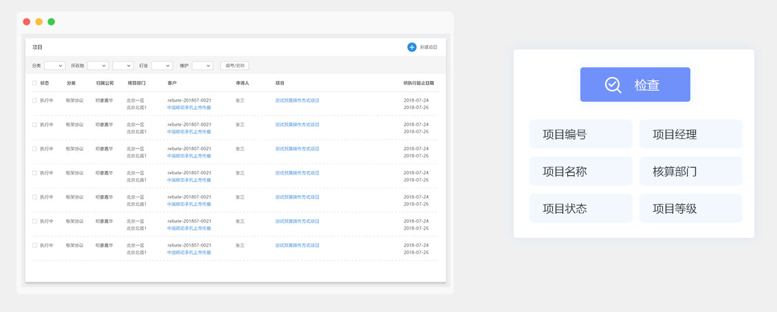 立項(xiàng)申請(qǐng)通過(guò)后自動(dòng)進(jìn)入項(xiàng)目庫(kù),與客戶和合同相關(guān)聯(lián),可按分類、等級(jí)、項(xiàng)目經(jīng)理等多種條件進(jìn)行檢索。